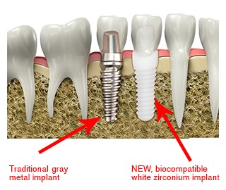 A titanium dental implant is similar in size and shape to a small screw, which is then inserted into your jaw. As the dental implant heals, your gums and bones will begin to fuse with the implant. Titanium implants were approved by the United States FDA in the 1980s, however since then, multiple concerns have arisen about having metal in your mouth on an ongoing basis. It’s estimated that 4% of Americans have titanium sensitivity, potentially leading to allergic reactions or other biochemical disruptions in the human body.